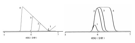 左圖:樣品質量對峰寬和峰型的影響,峰1到峰4,進樣質量逐漸增大。