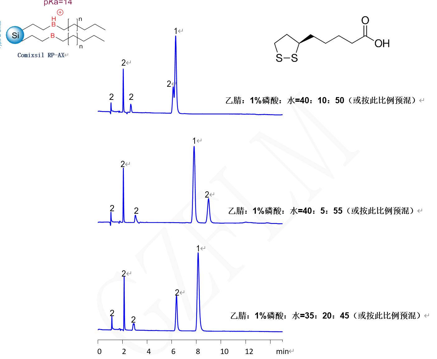 應(yīng)用說明:α-硫辛酸具有疏水基團和羧酸基團,利用 Comixsil RP-AX 與其的疏水作用和離子交換作用保留的分離。