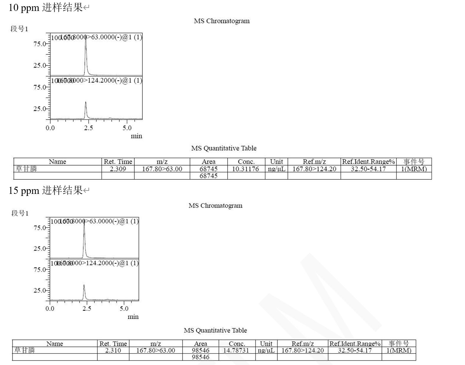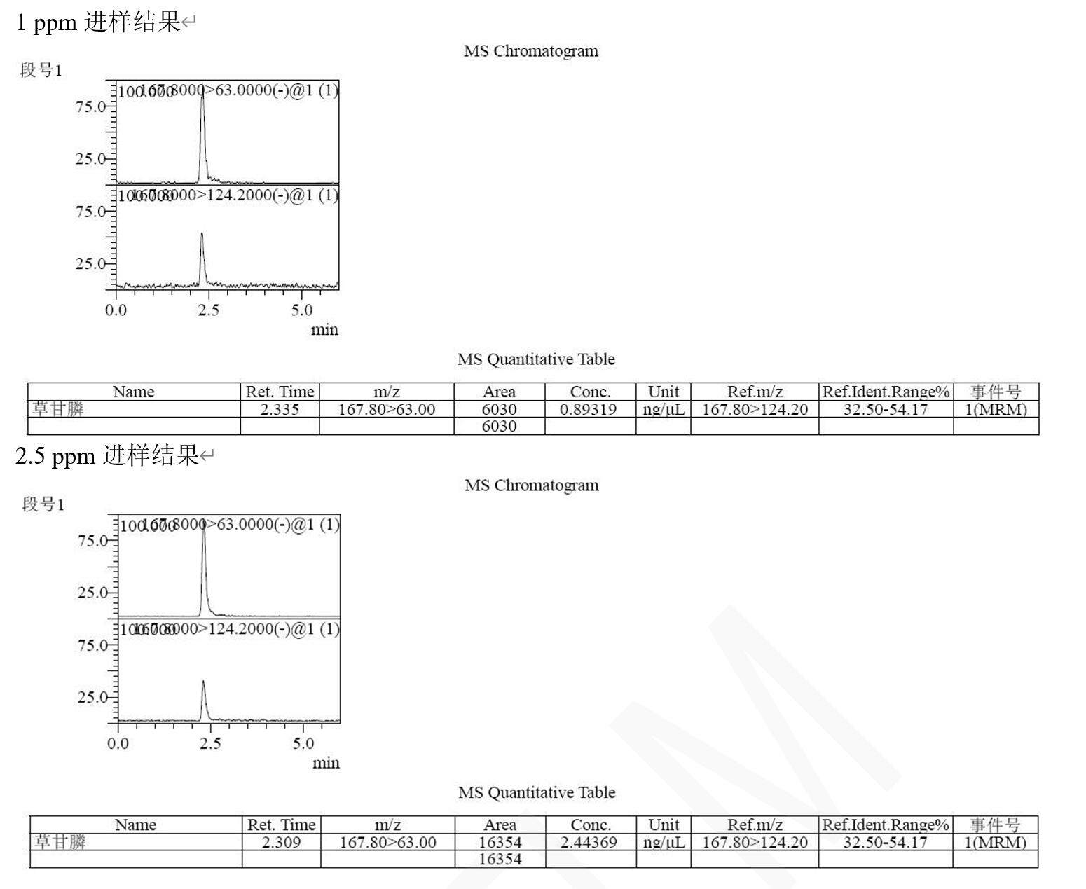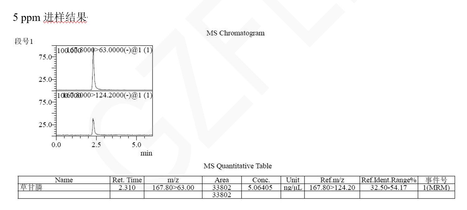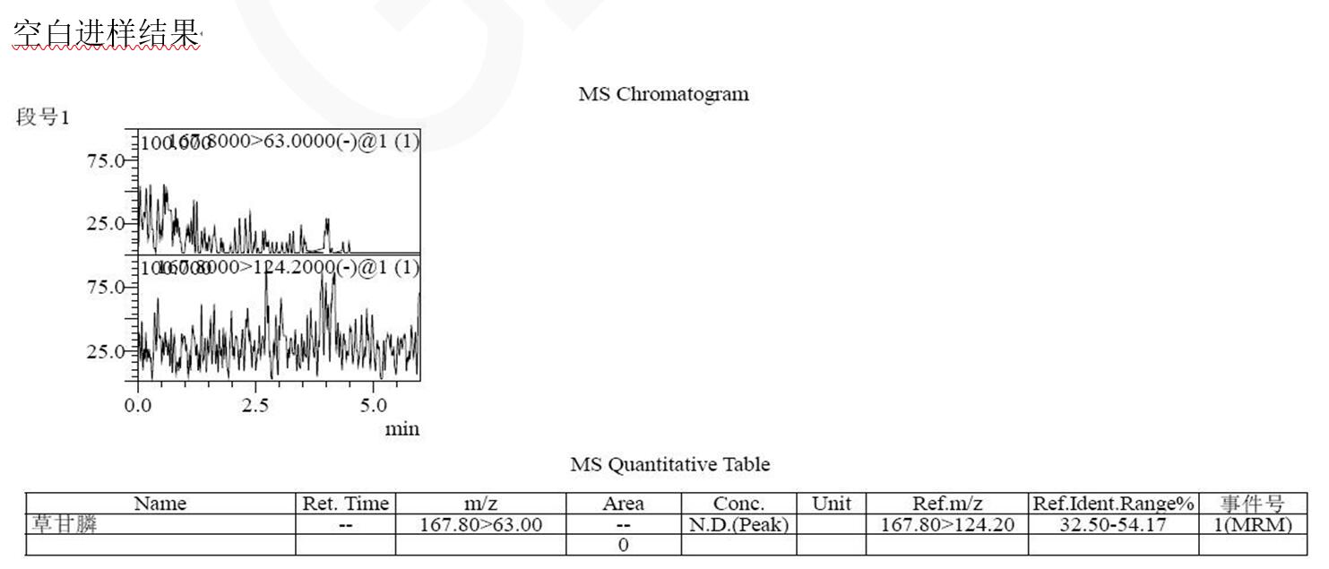 說明:本方法研究草甘膦不衍生直接檢測。相比于傳統(tǒng)衍生后用 C18 分析,或者用氨基柱不衍生 PH=10-11 條件下分析,帶來的復(fù)雜,耗時(shí),以及氨基柱結(jié)果重現(xiàn)與壽命上的問題。此方法簡單,快速,方便。可滿足常規(guī)分析檢測需求以及多數(shù)殘留檢測需求。
