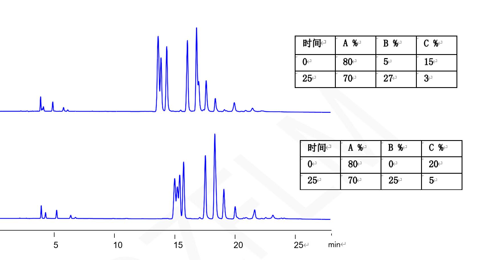 案例說明:Comixshell Oligo可在UV和MS檢測器中分析RNA類特質。相比一些離子交換柱要用到非揮發性鹽無法上質譜,以及一些C18要用到高濃度TEAA并添加六氟異丙醇上質譜,方便很多。