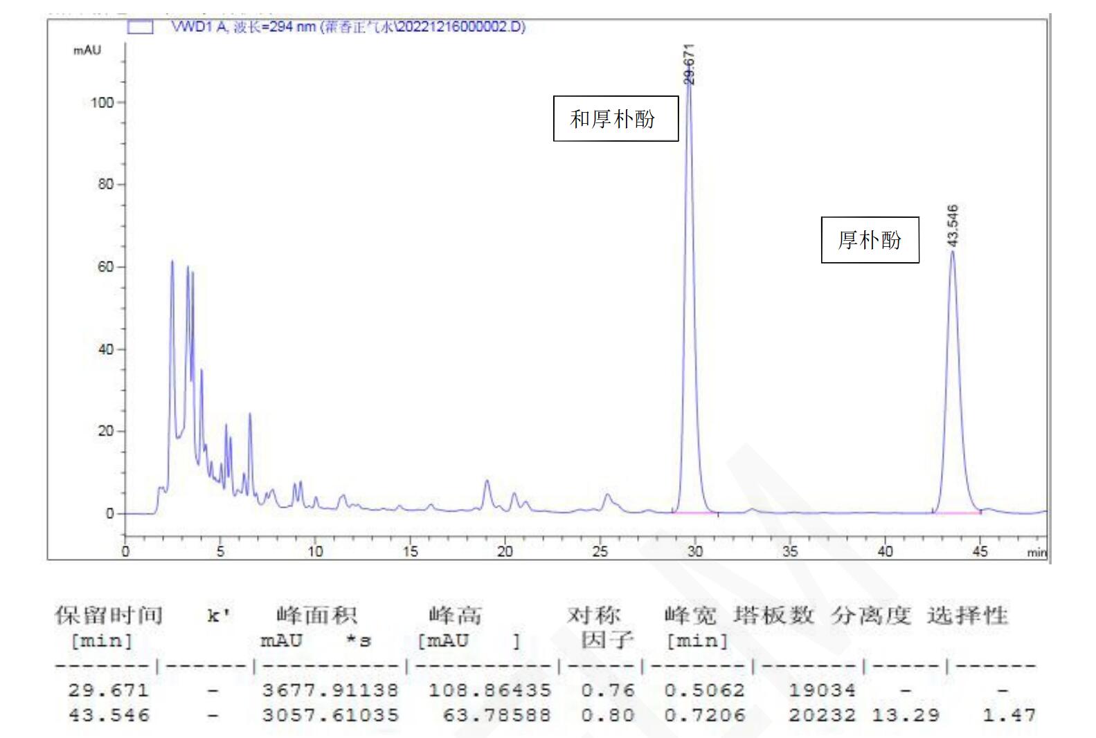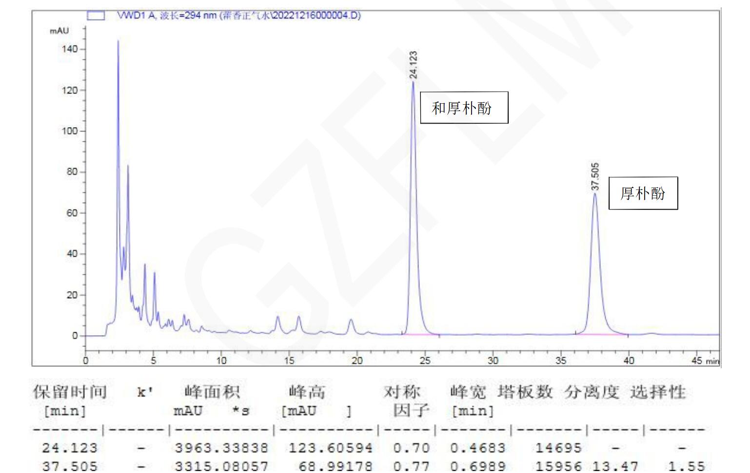 【厚樸測定】 理論塔板數按厚樸酚峰計算應不低于 5000
