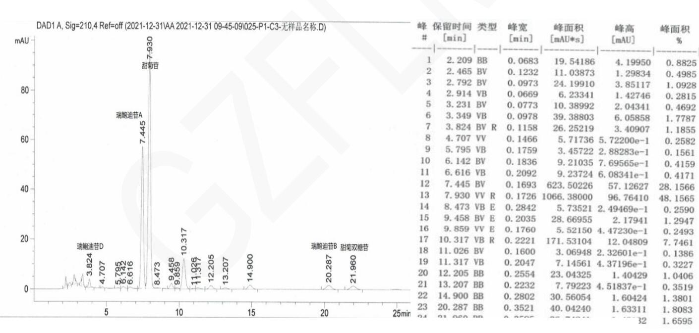 客戶評價:所有峰均滿足分離度要求。其中,最大進樣量下瑞鮑迪苷 A 與甜菊苷分離度 1.67(標準要求分離度 1.5)。若采用 Ttiank C18 3u 250*4.6mm 可獲得更大分離度。