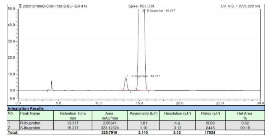 方法說明:該款反相手性色譜柱相比其它的正相方法,采用簡單的反相流動相體系,更為實用方便。峰形對稱,柱效高。藥典要求理論板數(shù)按右布洛芬峰計算不低于 2000,右布洛芬峰與左布洛芬峰之間的分離度應(yīng)大于3.0,此反相方法也完全符合藥典的指標(biāo)要求。