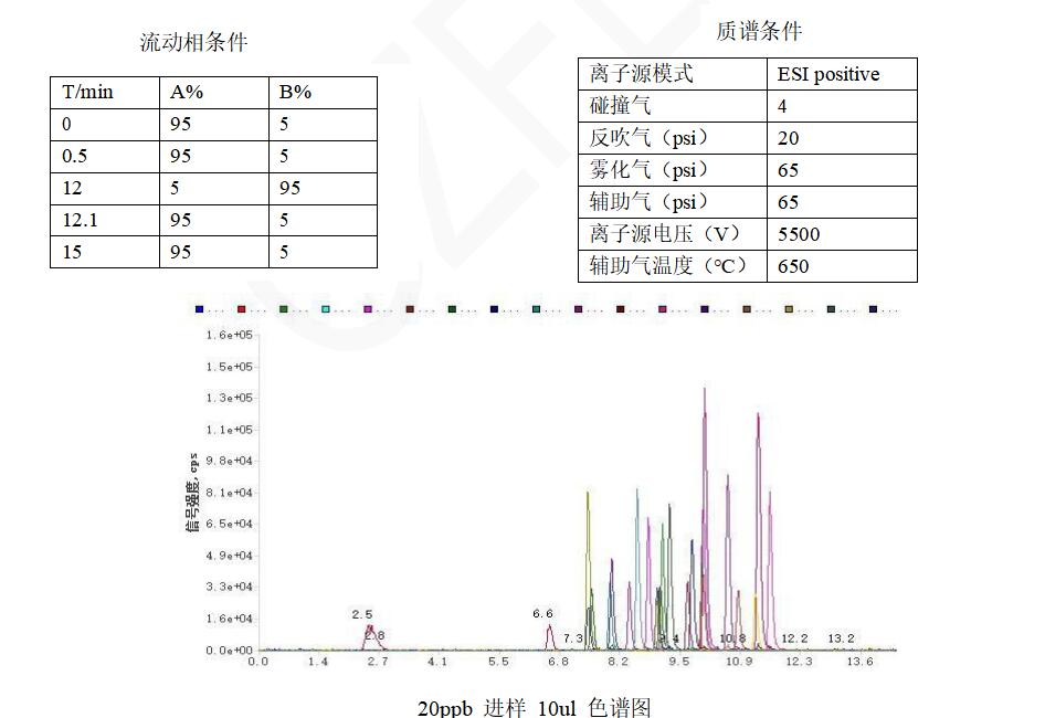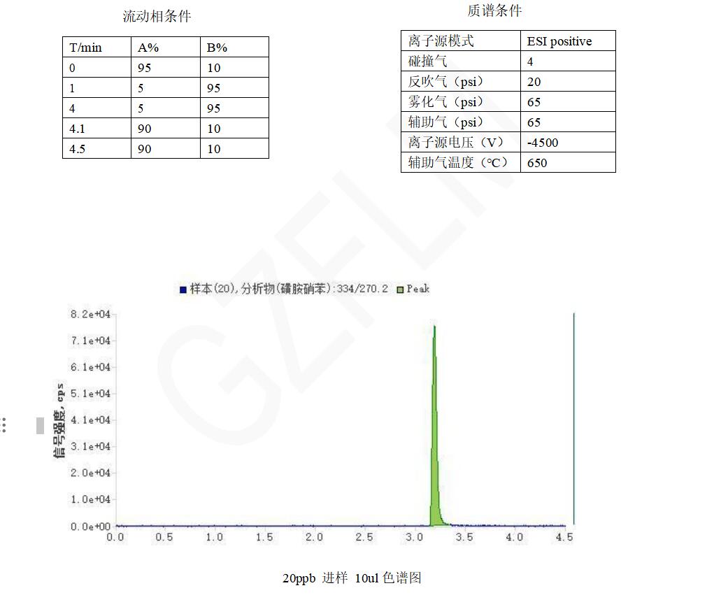App ID:FLM-T240005 磺胺脒、磺胺醋酰、磺胺嘧啶等 23 種磺胺測定 色譜柱:Titank C18 1.8u 100*2.1mm( FMD-5558-BONU) 流動相 A:0.1%甲酸水 流動相 B:甲醇流速:0.25ml/min 進(jìn)樣體積:10μl 柱溫: 35℃ 儀器: 廣州質(zhì)譜技術(shù)有限公司 LCMS-TQ480 三重四極桿串聯(lián)質(zhì)譜儀; 廣州質(zhì)譜技術(shù)有限公司 UPLC-480 超高效液相儀; 標(biāo)準(zhǔn)物質(zhì):磺胺 23 項(xiàng)混標(biāo):包含磺胺脒、磺胺醋酰、磺胺嘧啶、磺胺二甲嘧啶、磺胺索嘧啶、磺胺噻唑、磺胺吡啶、磺胺甲嘧啶、磺胺甲氧嗪、甲氧芐啶、磺胺甲二唑、磺胺對甲氧嘧啶、磺胺氯噠嗪、磺胺甲惡唑、磺胺間甲氧嘧啶、磺胺多辛、磺胺異惡唑、磺胺惡唑、磺胺苯酰、磺胺苯吡唑、磺胺間二甲氧嘧啶、磺胺喹 惡啉、磺胺硝苯,由甲醇配制,濃度為 1ppm;磺胺 22 種(正離子模式)