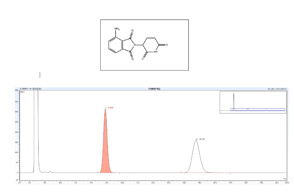 App ID: FLM-B250011 Chiral NQ(2)-RH 手性色譜柱對泊馬度胺的檢測 方法:自定 色譜柱: Chiral NQ(2)-RH 5u 250*4.6mm (貨號:FMG-AC5-A06-R) 流速:0.8mL/min 檢測:UV 220nm 25oC 樣品濃度:N/A 進(jìn)樣量:2uL 流動(dòng)相:咨詢銷售 色譜圖: ![]() |