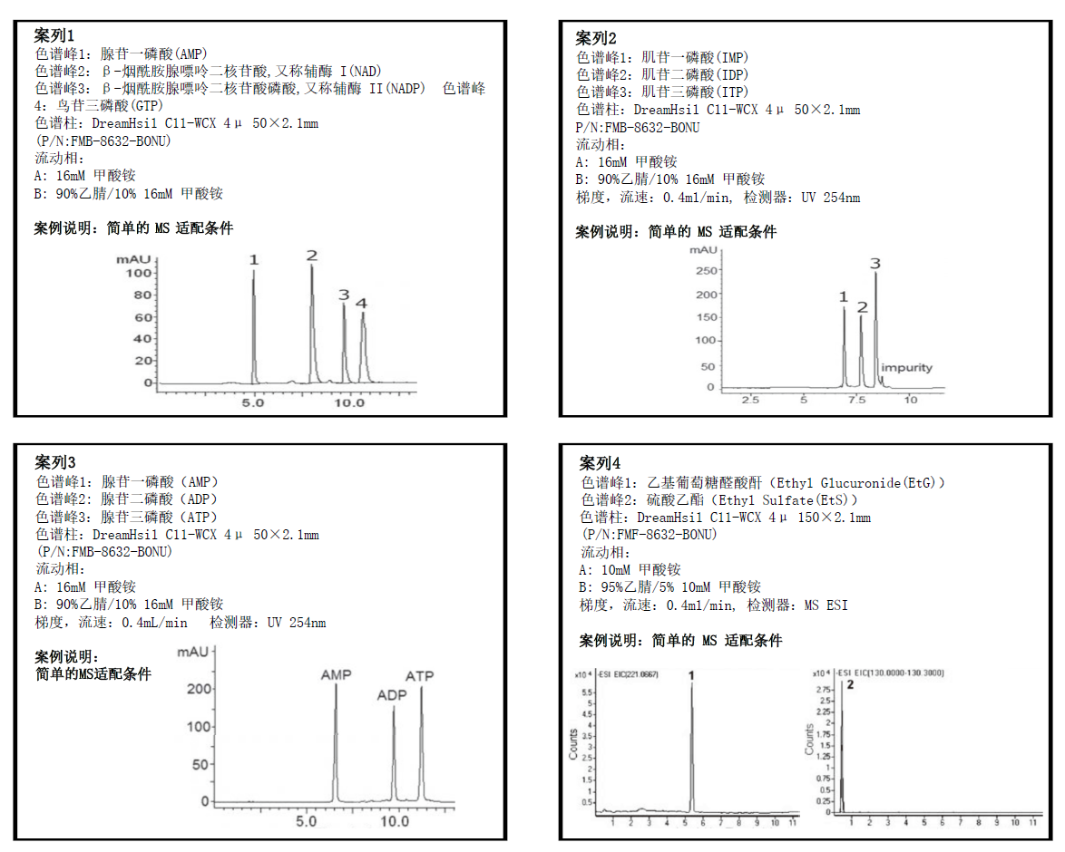 當流動相的pH高于6時,羧基 90%電離成帶負電基團,而PH在6.9以上時,幾乎全部電離,此時,可以主要考慮它的陽離子交換作用。 DreamHsil C11-WCX 色譜柱是分析人員用LC-MS分析相似物質時的一個好選擇。